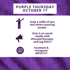 Purple Thursday is October 23rd. On this national day of awareness, individuals around the nation wear purple, the color for domestic violence awareness. Make sure to post on social media, tag us, and say why you are wearing purple! Use the hashtags #DVAM, #PurpleThursday and #loveequalsrespect
